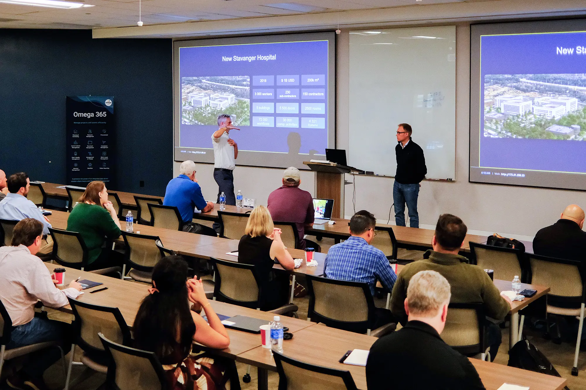 Gathering both current and potential customers, Carlsen and Brataas shared insights from the project, showcasing how Omega 365 was applied to manage the challenges of such a large-scale development.