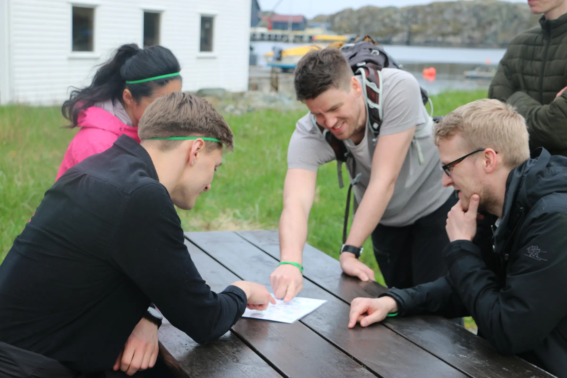 The team engaged in social activities amidst the charming landscape of Røvær island.